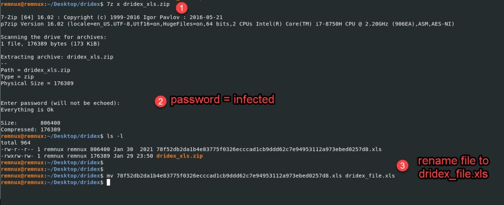 To start of with we will unzip this malware using 7z on the REMnux. In my case I renamed the file to “dridex_xls.zip”