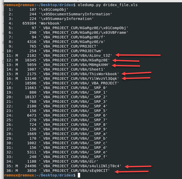 When I run oledump.py on the dridex_file.xls I get the following output: