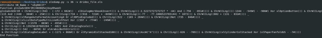 Oledump Command: oledump.py -s 36 -v dridex_file.xls