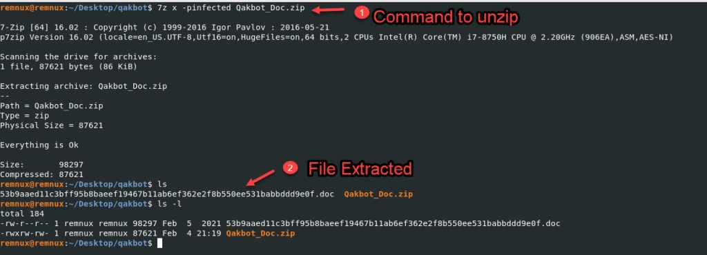 Command: 7z x -pinfected Qakbot_Doc.zip