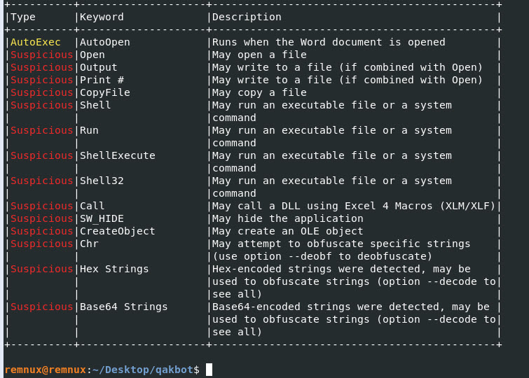 Command: olevba Qakbot_doc.doc –decode