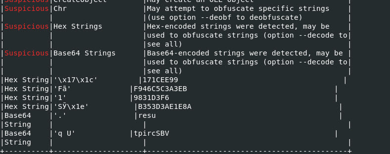 The output from OLEVBA tells us that some suspicious keywords were found in the file, some execute commands and base 64 encoding potentially found.