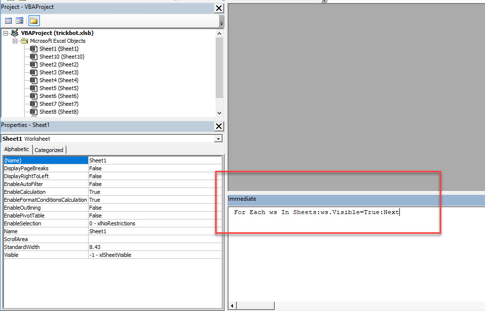 Lets try and uncover any hidden worksheets by using the command below within the debugger immediate window.