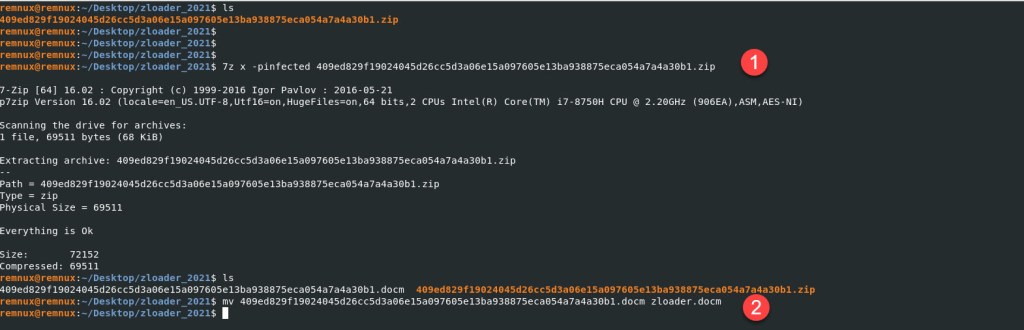 Command 2: mv 409ed829f19024045d26cc5d3a06e15a097605e13ba938875eca054a7a4a30b1.docm zloader.docm