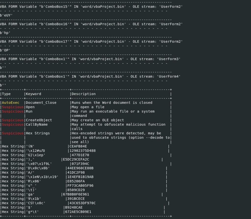 Using the OLEVBA tool shows me that the file is using some UserForm* type of OLE Stream. It also shows us some suspicious keywords that maybe malicious.