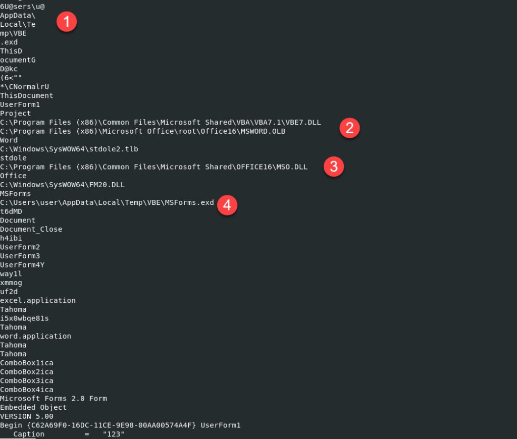 Looking at the Number 1 we can see some type of potential file path and file creation “AppData\Local\Temp\VBE.exd”, we can also see at Number 2, some native files that can lead us to alert on false positive activity if we monitored this DLLs. At Number 4 23 can see the call or execution of a file “C:\Users\user\AppData\Local\Temp\VBE\MSForms.exd”